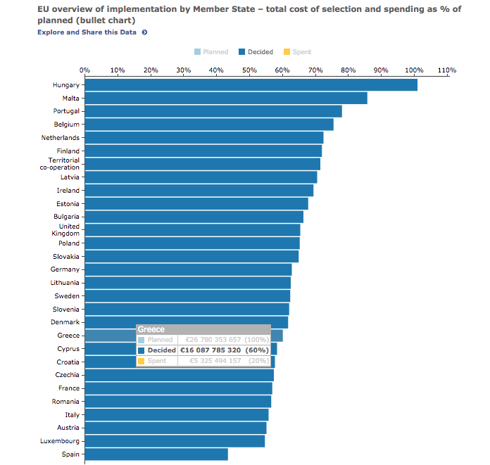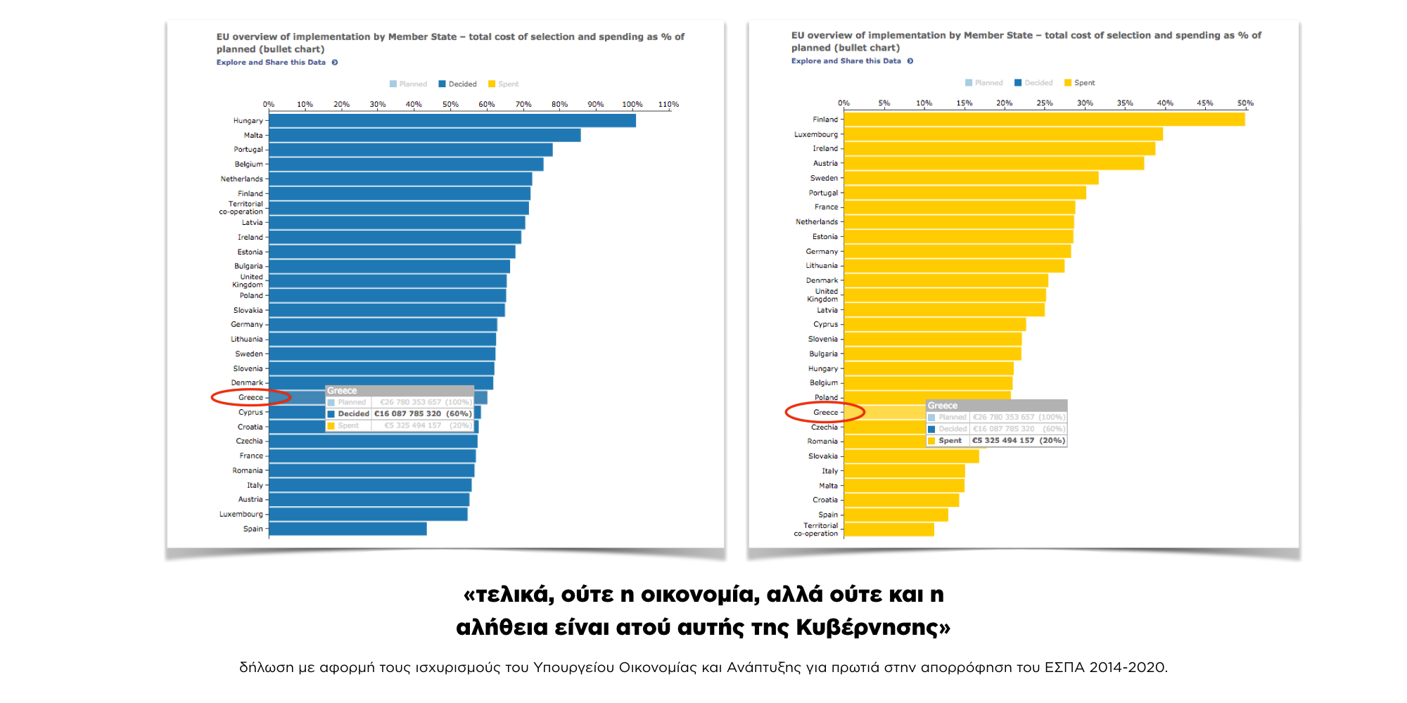 Με μια απλή επίσκεψη ωστόσο στην επίσημη ιστοσελίδα της Ευρωπαϊκής Επιτροπής για την παρακολούθηση της απορρόφησης των ευρωπαϊκών πόρων, διαπιστώνει κανείς ότι: Η Ελλάδα με μόλις 20% είναι 21η ανάμεσα στις 28 χώρες της Ευρωπαϊκής Ένωσης σε δαπάνες ΕΣΠΑ 2014-2020, δηλαδή σε χρήματα που έχουν πραγματικά φτάσει στους δικαιούχους. Επίσης, η Ελλάδα είναι μόλις 19η σε δαπάνες που έχουν συμβασιοποιηθεί και μελλοντικά θα εκτελεστούν.