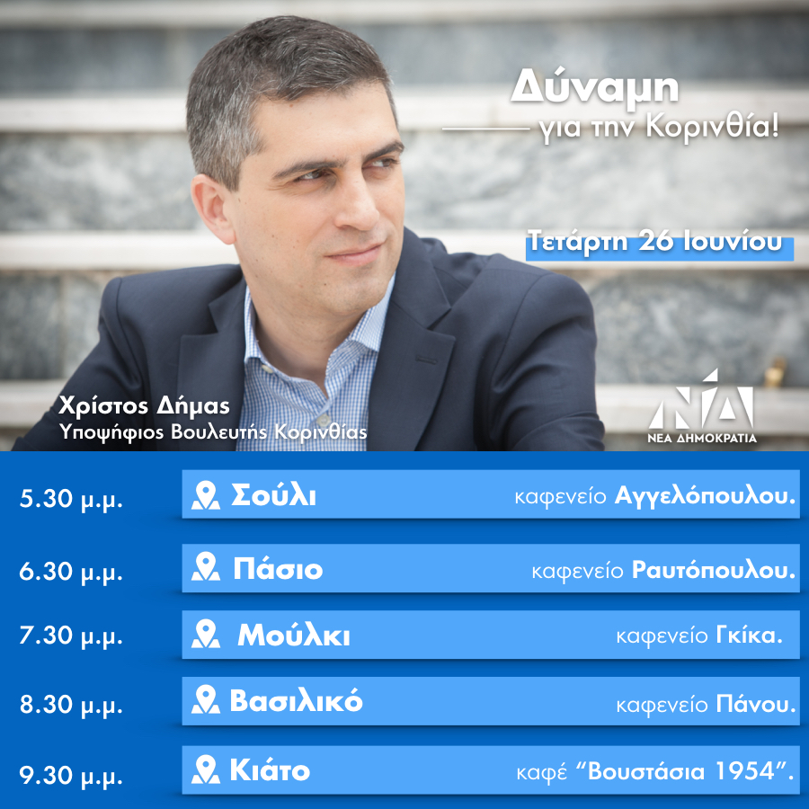 Σήμερα, Τετάρτη ο κ. Δήμας έχει προγραμματισμένες επισκέψεις και συγκεντρώσεις στο Σούλι, το Πάσιο, το Μούλκι, το Βασιλικό και θα κλείσει την ημέρα στο Κιάτο με ομιλία στο καφέ «Βουστάσια 1954» στις 9,30.