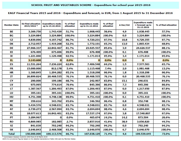 Η Ευρωπαϊκή Επιτροπή με πρόσφατο έγγραφό της ανακοίνωσε την απορροφητικότητα ανά κράτος-μέλος του προγράμματος διανομής στα σχολεία φρούτων και λαχανικών προϋπολογισμού 150 εκ. ευρώ για την περίοδο 2015-2016. Η Βουλγαρία, η Ουγγαρία και η Λιθουανία έχουν απορροφήσει το σύνολο των πόρων που τους αναλογούσε. Άλλες χώρες όπως η Κύπρος και η Κροατία απορρόφησαν το 84.8% και το 96.9% αντίστοιχα[1].