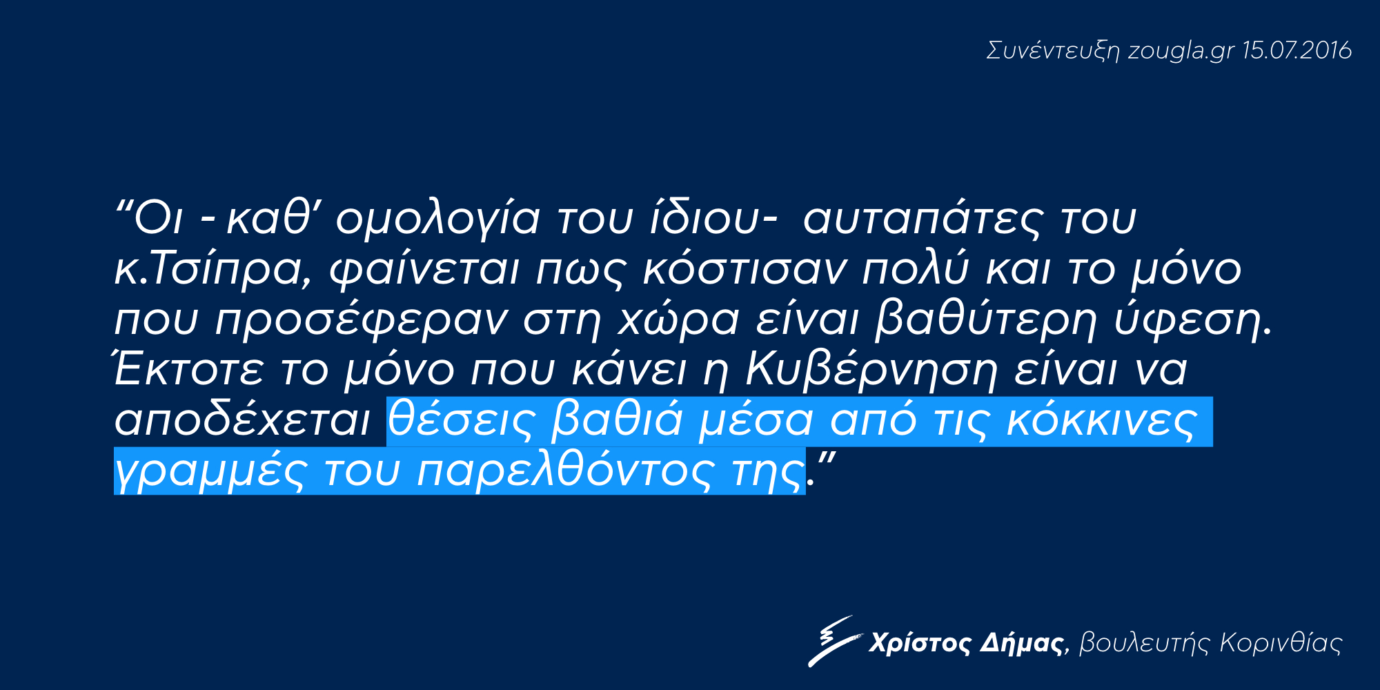 Συνέντευξη εφ’ όλης της ύλης στη δημοσιογράφο κ. Άντζελα Πεΐτση για την ιστοσελίδα zougla.gr παραχώρησε ο βουλευτής Κορινθίας Χρίστος Δήμας. Ο κ. Δήμας μίλησε για το ζήτημα του εκλογικού νόμου, την κατάσταση στην οικονομία και την αγορά αλλά και τις πολιτικές εξελίξεις.