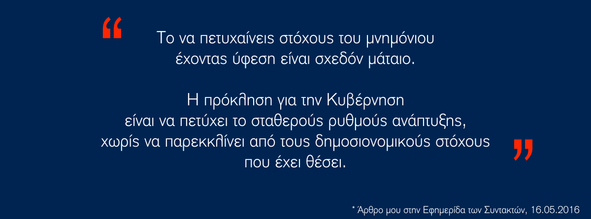 Το να πετυχαίνεις στόχους του μνημόνιου έχοντας ύφεση είναι σχεδόν μάταιο. Η πρόκληση για την κυβέρνηση της χώρας είναι να πετύχει το συντομότερο σταθερούς ρυθμούς ανάπτυξης, χωρίς να παρεκκλίνει την ίδια στιγμή και από τους δημοσιονομικούς στόχους που έχει θέσει. Αντικειμενικά δύσκολος στόχος, όμως μία κυβέρνηση με φιλελεύθερο προσανατολισμό και συγκεκριμένο σχέδιο για την οικονομία και μπορεί και πρέπει να το πετύχει.